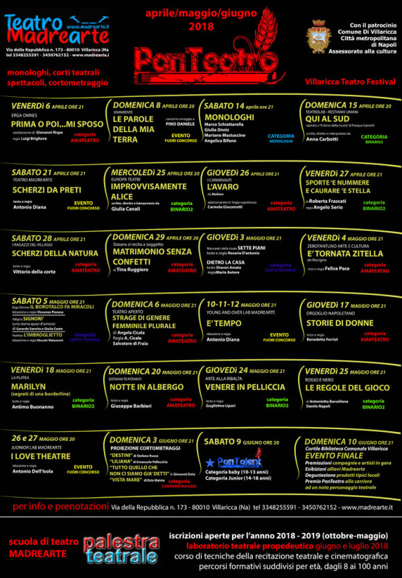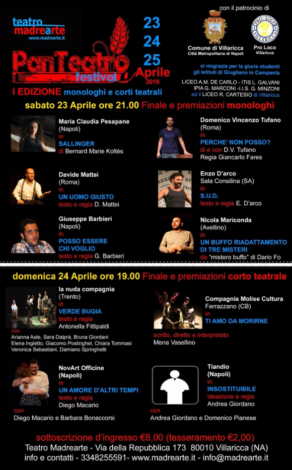 L'associazione Teatro Madrearte, con il patrocinio del Comune di Villaricca e la Pro Loco cittadina, è fondatrice del PANTEATRO festival che, dopo la fase selettiva vedrà le esibizioni sul palco del Teatro Madrearte di Villaricca, di sei finalisti in gara sabato 23 per la sezione monologhi e di quattro compagnie per la sezione corto teatrale domenica 24.