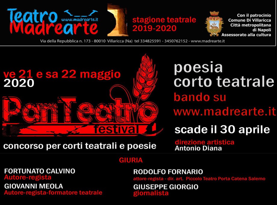 L'associazione Teatro Madrearte, con il patrocinio del Comune di Villaricca Provincia di Napoli, nell'ambito delle iniziative per lo sviluppo e la promozione di eventi culturali ed artistici di Napoli Nord, è fondatrice del PanTeatro Festival e sottoscrive il seguente bando pubblico rivolto a liberi professionisti, gruppi teatrali ed istituti di ogni ordine e grado provenienti da tutta l'Italia.