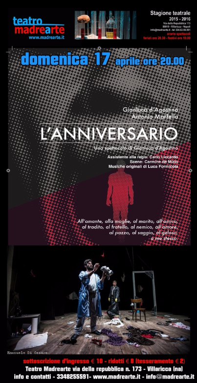 Prossimo appuntamento al Teatro Madrearte per la stagione teatrale 2015-2016 #primaverateatro, il Teatro coop Galleria Toledo presenta l'anniversario, scritto e diretto da Gianluca d'Agostino.