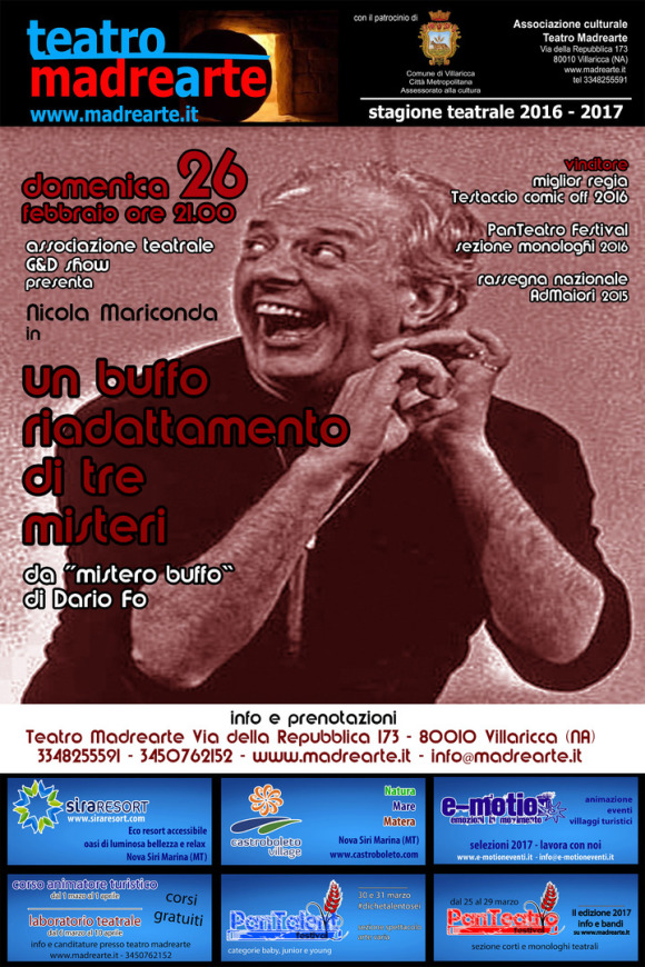 Questo progetto nasce due anni fa, ideato e realizzato dall’attore campano Nicola Mariconda, che rielabora e riscrive, servendosi di altri dialetti (dialetto campano e lombardo/veneto), tre testi tratti da “Mistero Buffo” di Dario Fo, tre Giullarate: