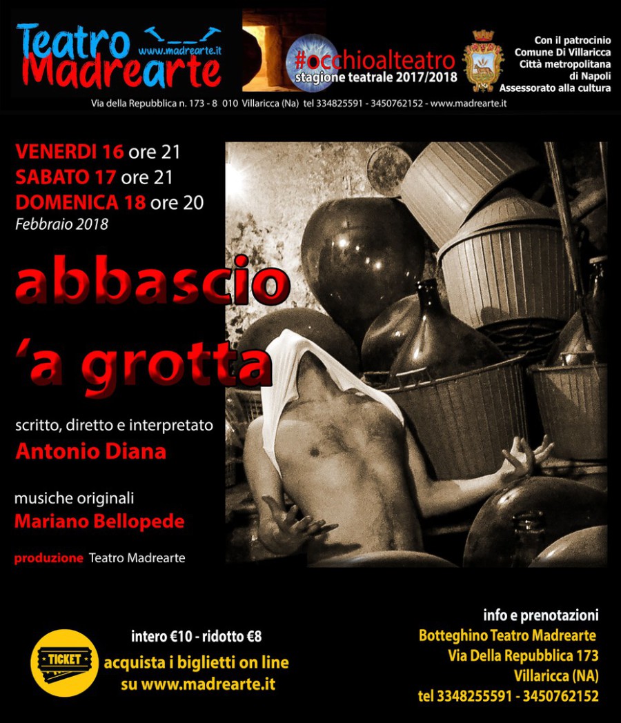 Abbascio 'a grotta, un eufemismo per dire "di sotto, in cantina", simbolo di un luogo oscuro, il più oscuro che esista, fisico o mentale, l'anticamera delle violenze domestiche. Potrebbe essere il sottoscala di casa vostra come il subconscio, individuale e collettivo, un riflesso della violenza generata quotidianamente nella società in cui viviamo. Con l'esplodere della violenza, a partire da quella sessuale e dal femminicidio, uomini, donne, omosessuali, bambini, convivono drammaticamente in un racconto poetico e drammatico, fatto di esperienze di violenza unificate dallo stesso ed inconsolabile tormento interiore.